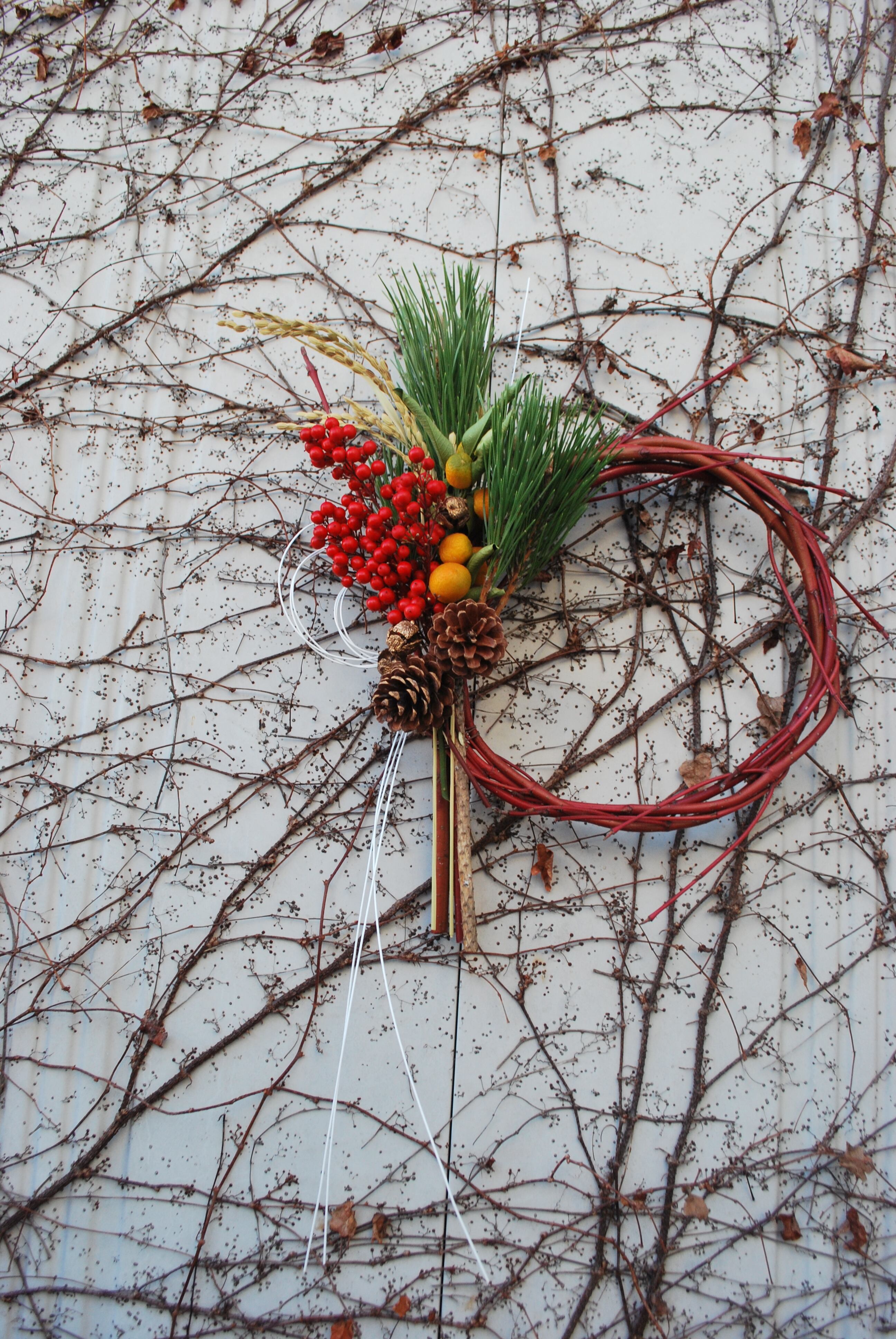 厄除けを込めた赤い枝をしめ飾りのようにデザインした輪飾りのタイプと