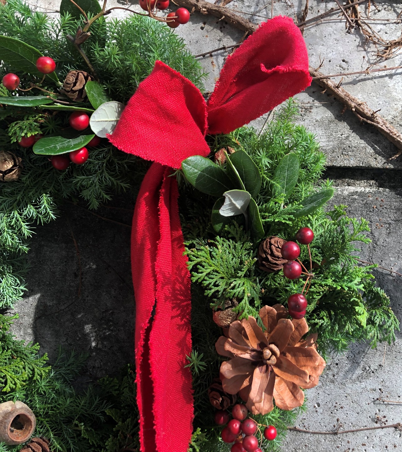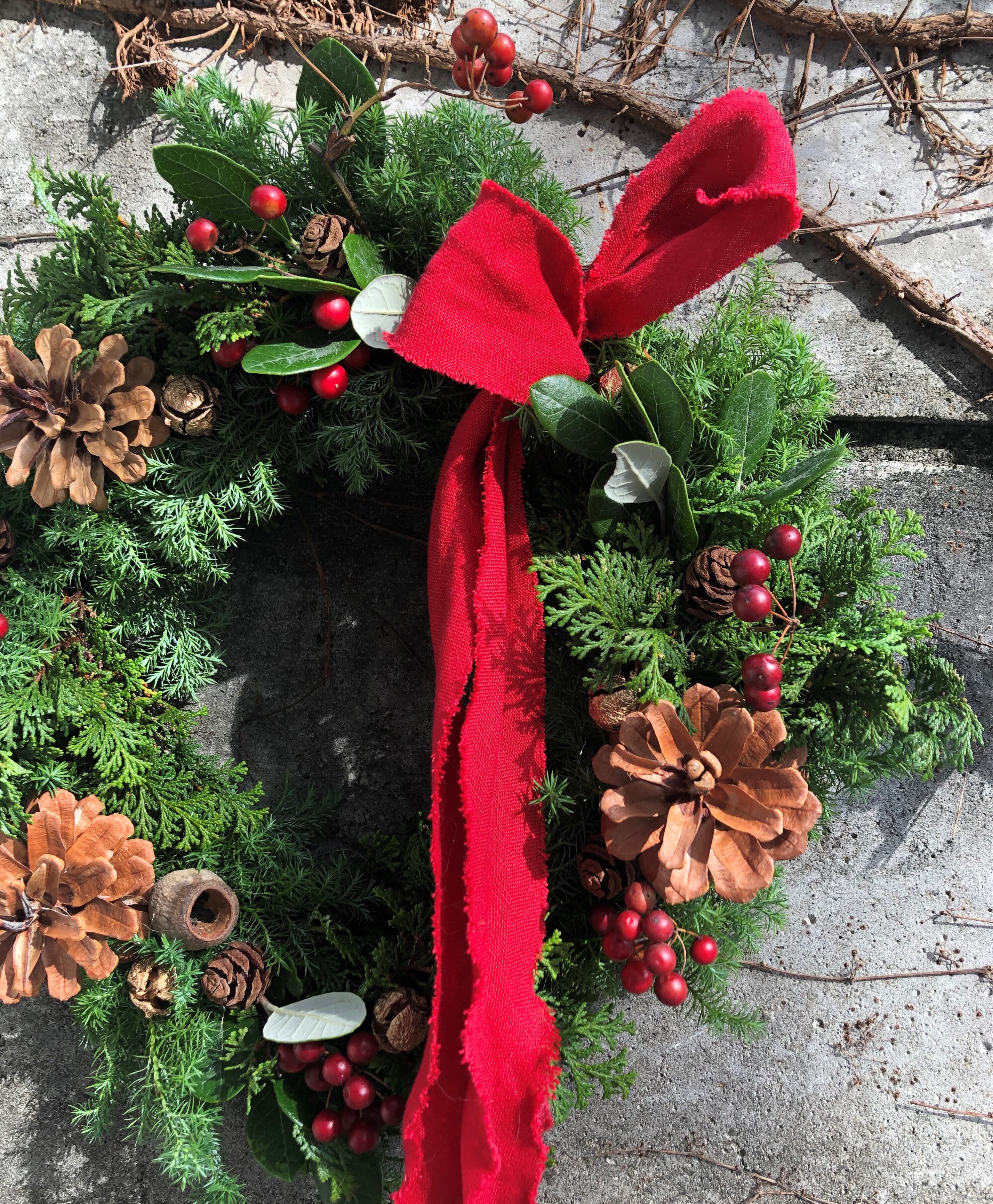 直径40cm前後グリーンリングに松の実・ユーカリ・赤い実などで