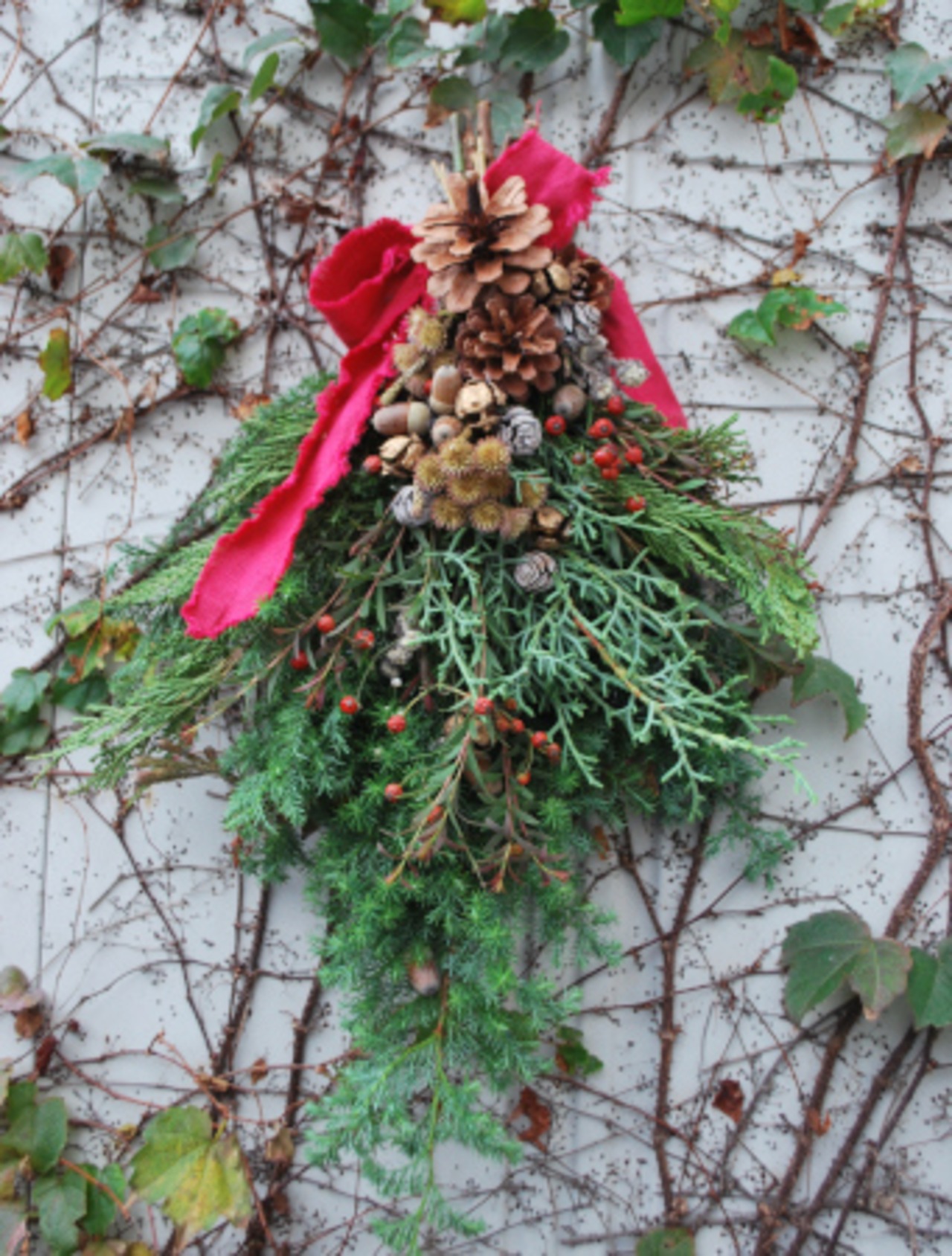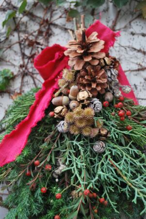 スワッグタイプに松の実・ユーカリ・赤の実などで